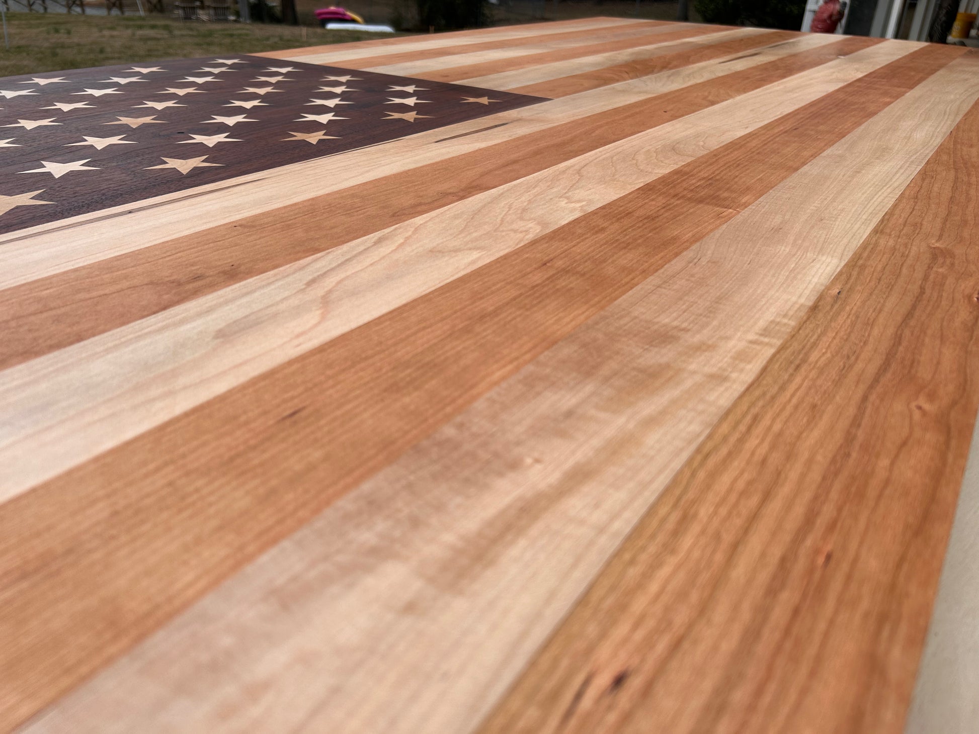Looking for the ultimate American Flag to flank a big wall, auditorium, side of a barn? This is the one for you then! Measures at 39" tall and 74" long, this bad boy is made from Walnut(Union), Cherry and Maple(stripes) and Inlay Maple Stars. Rear bracing and a French Cleat make up the rear of the flag to keep from unwanted movement and to hang on the wall!