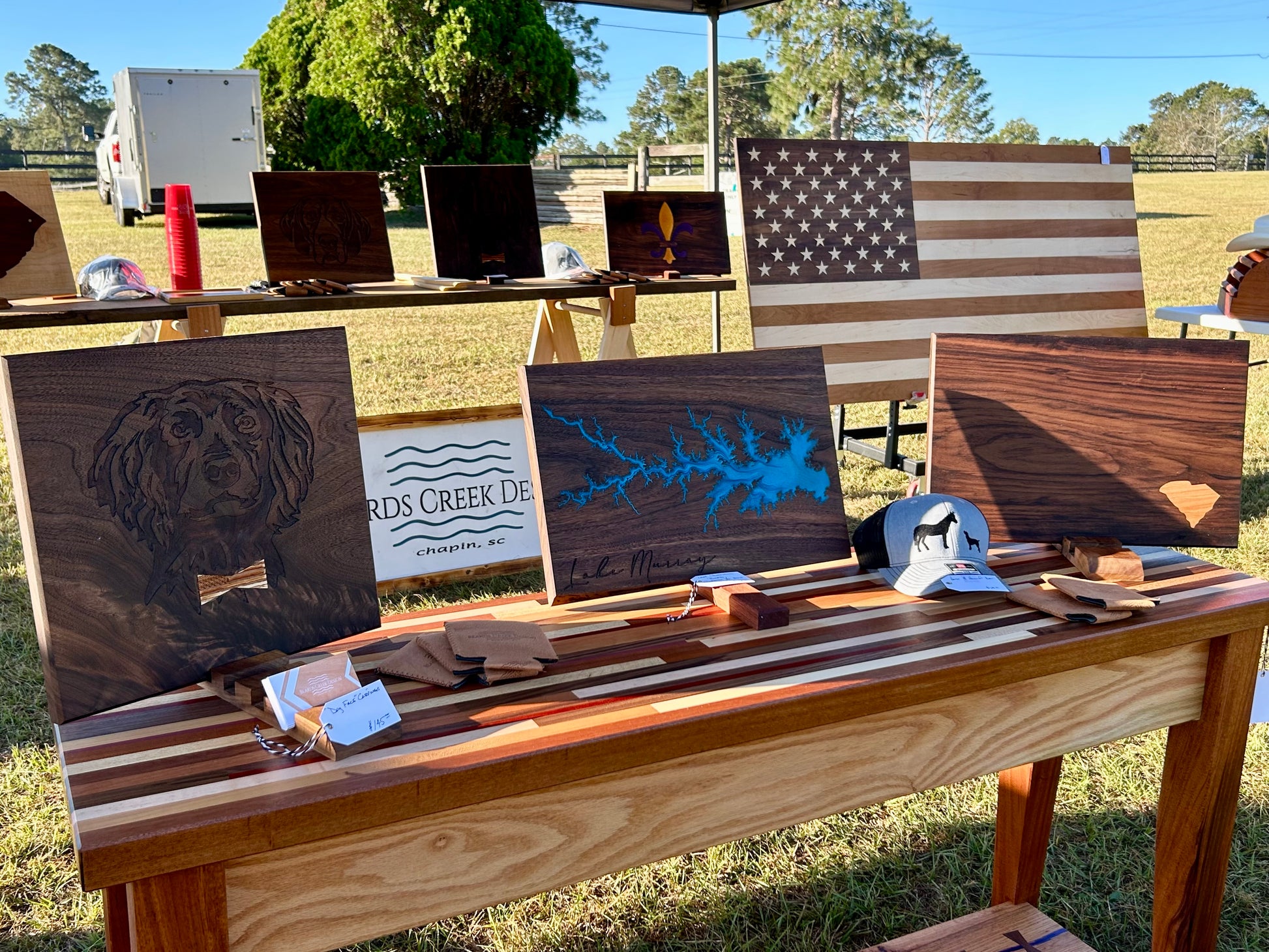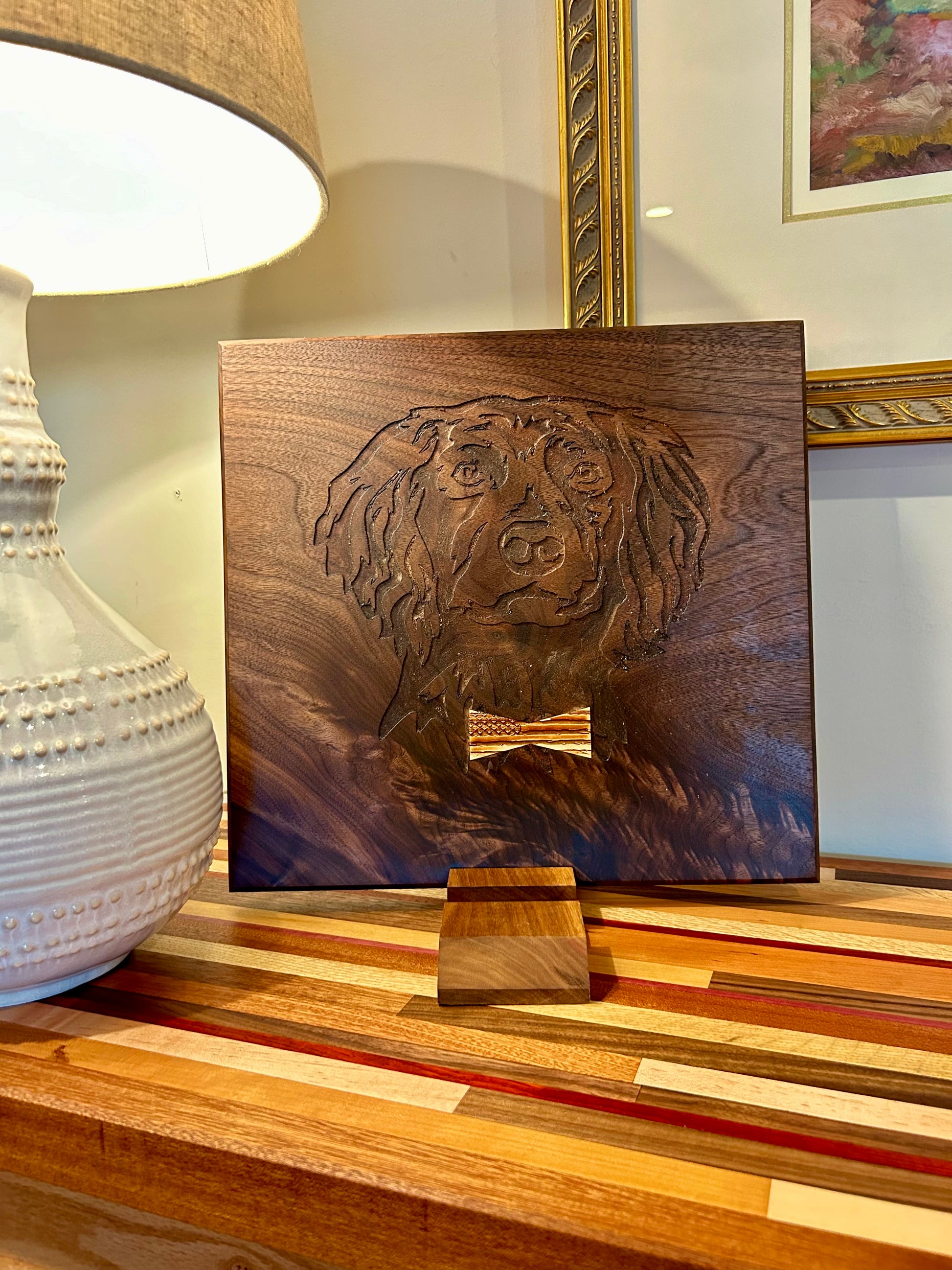 Sized at 14" x 16" on black walnut that includes; Dog face, Dog name. Additional fees for bowties, cleats, stands etc.