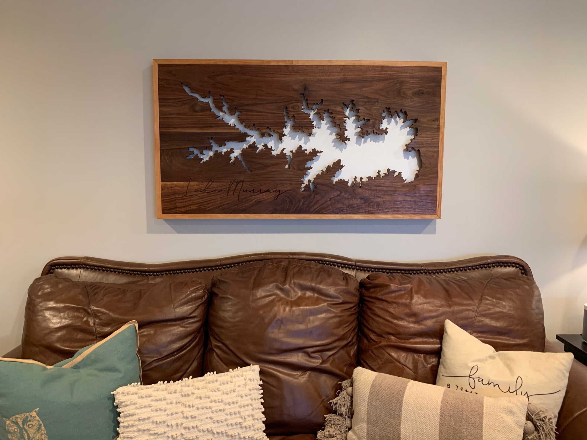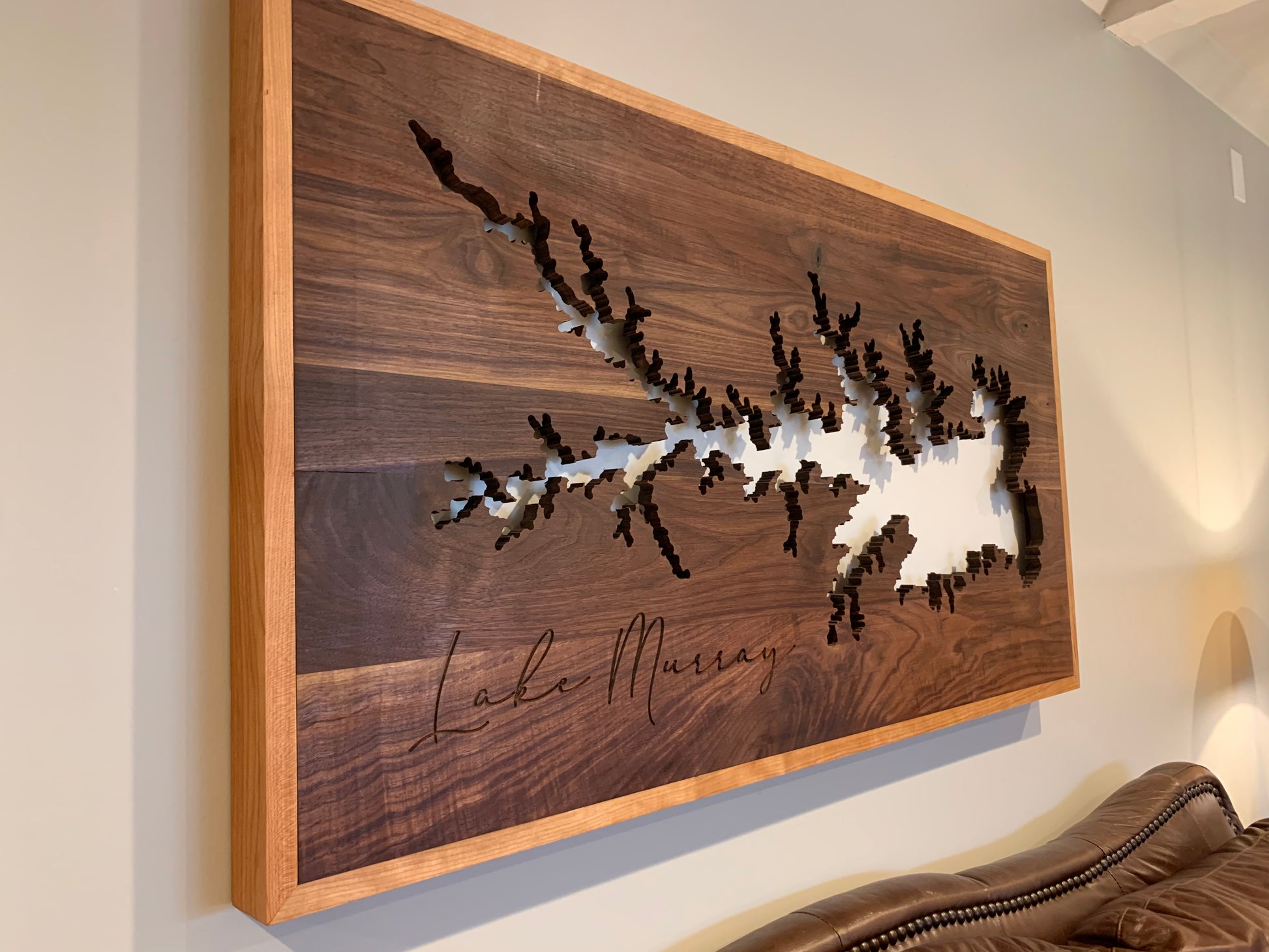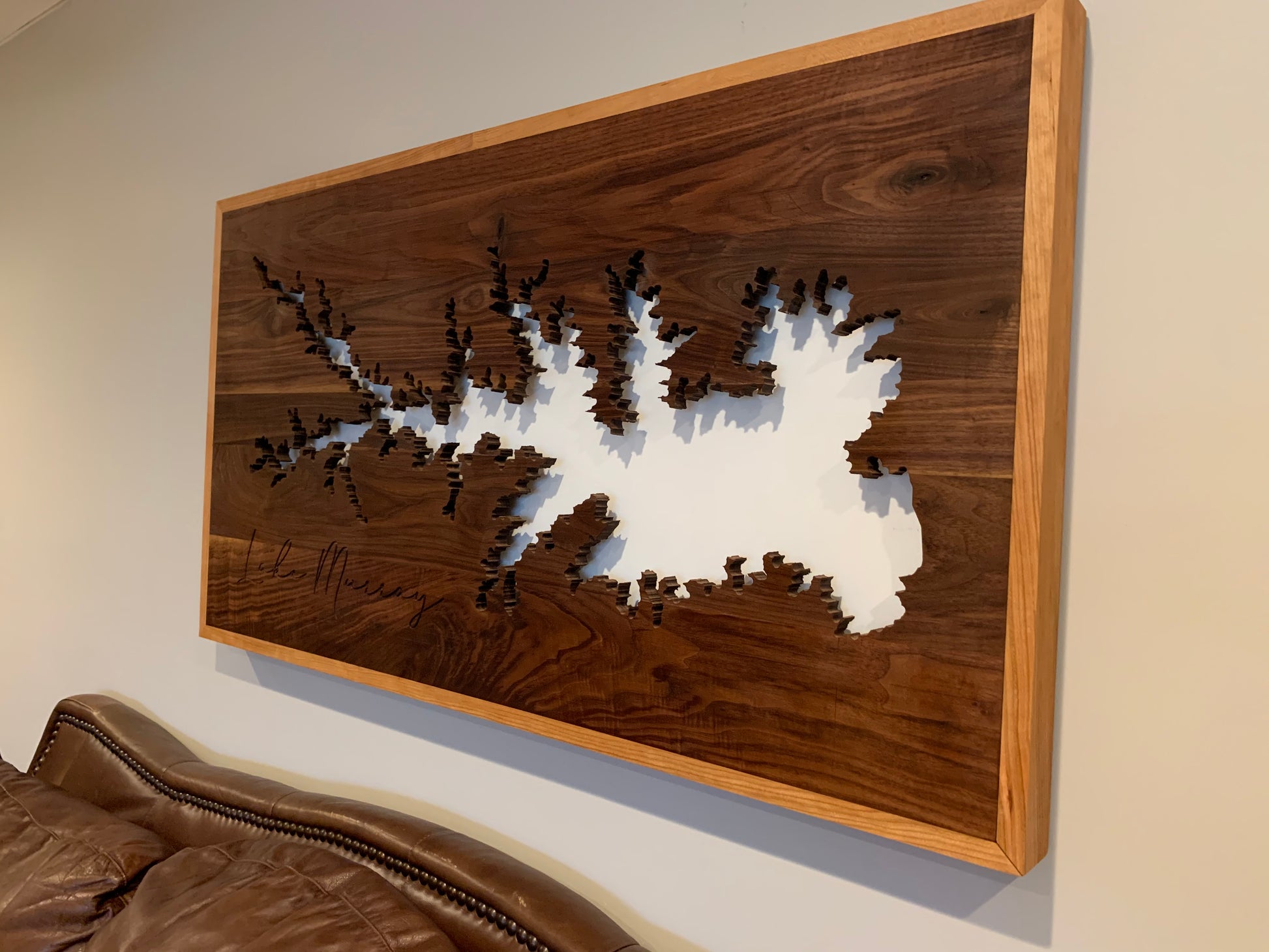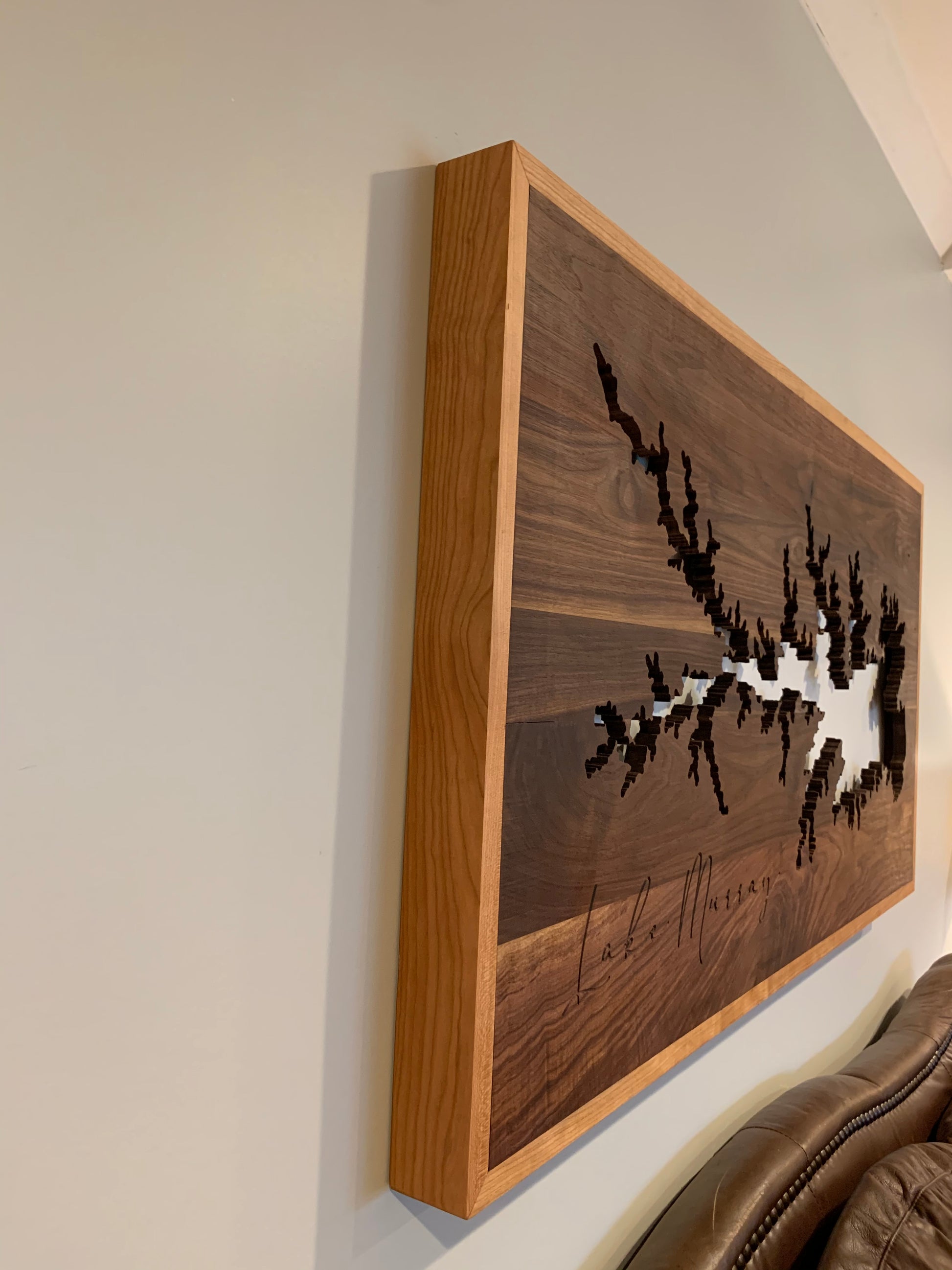 We make these Wall Art pieces with 4/4 Black Walnut, Cherry or Mahogany, then wrapped(framed) with a corresponding hardwood, engraved on the CNC, add on a painted or stained backing, install a LED light kit, add on the French Cleats and finished by hand with oils to last a lifetime!