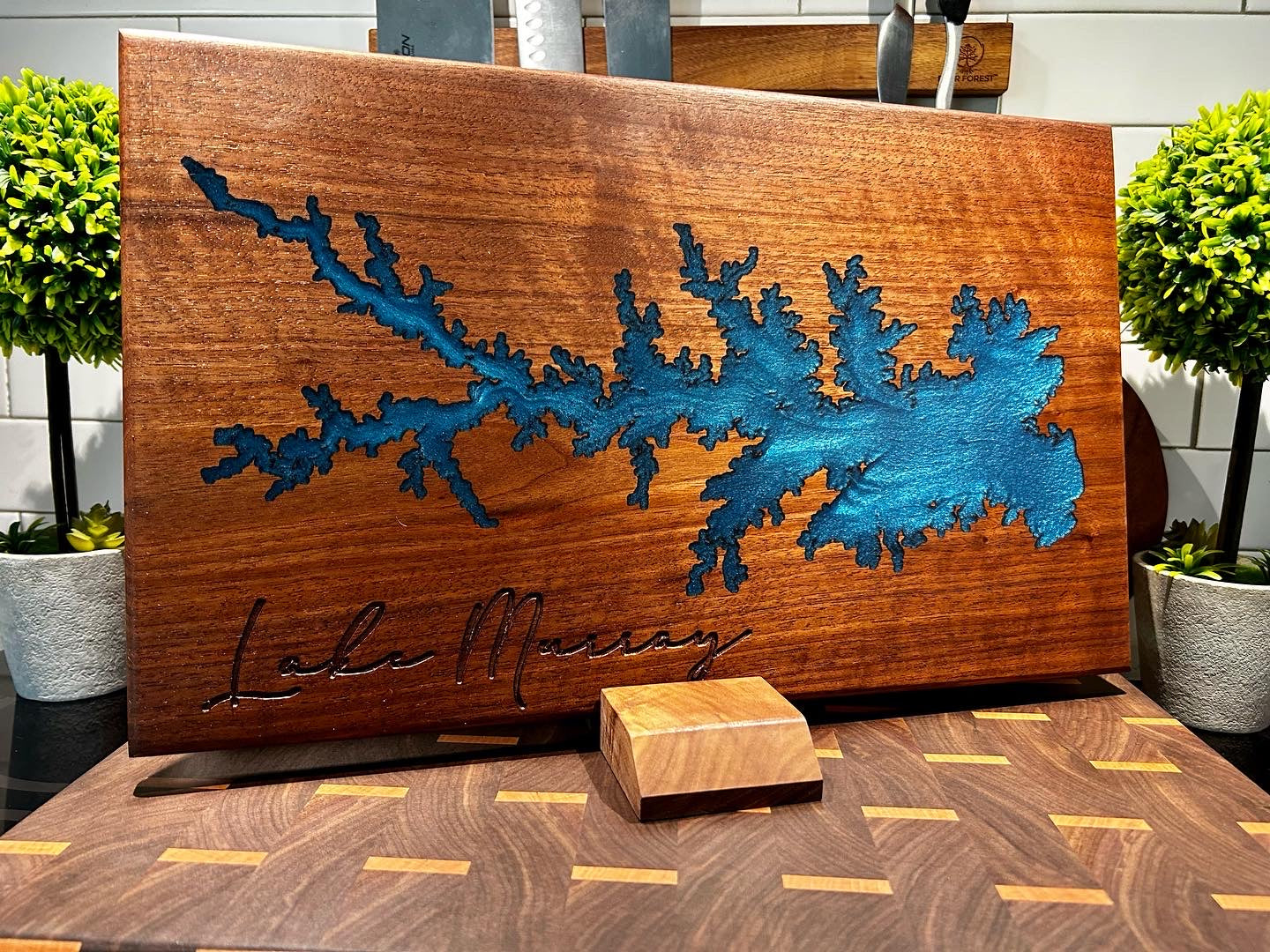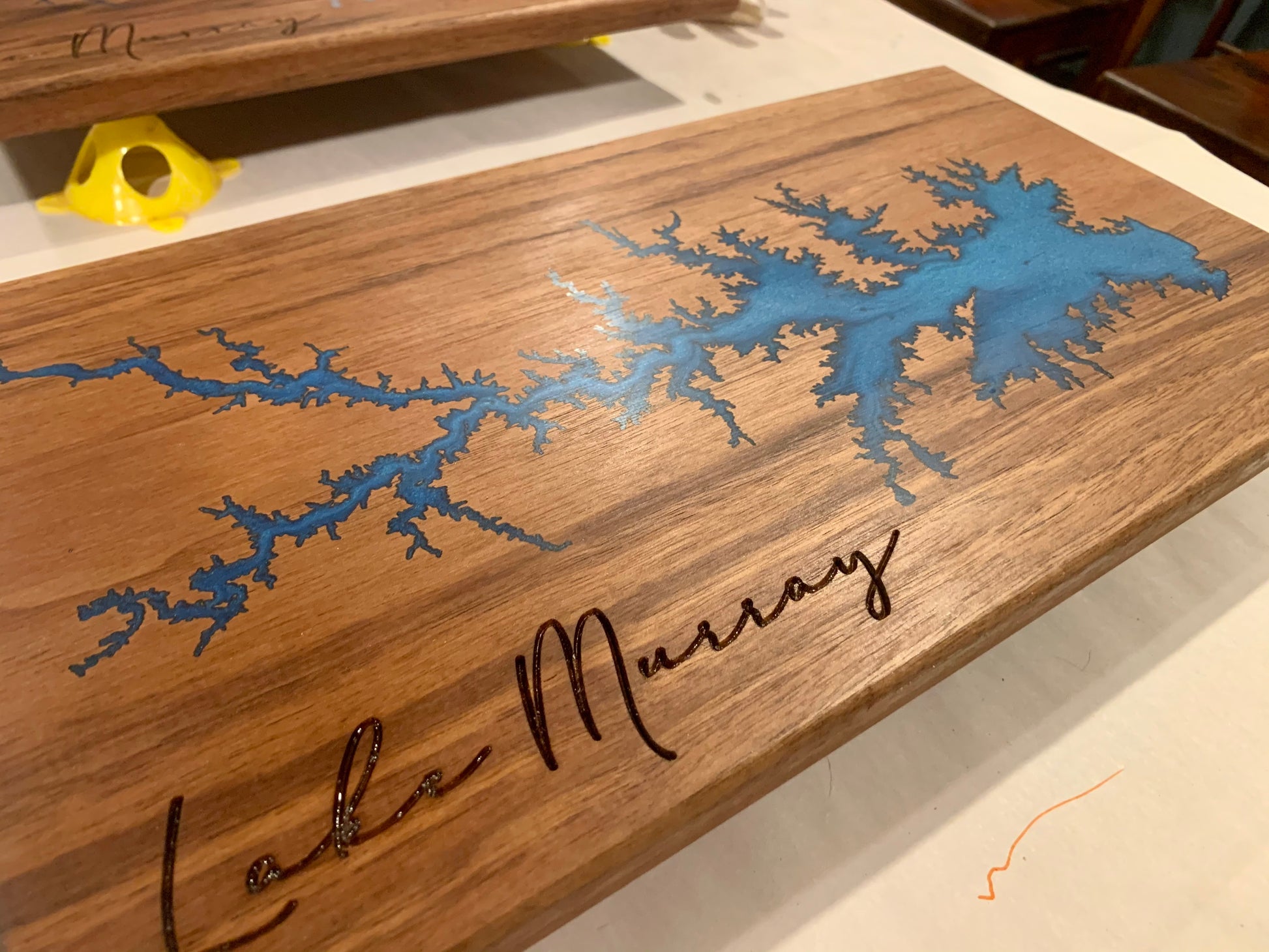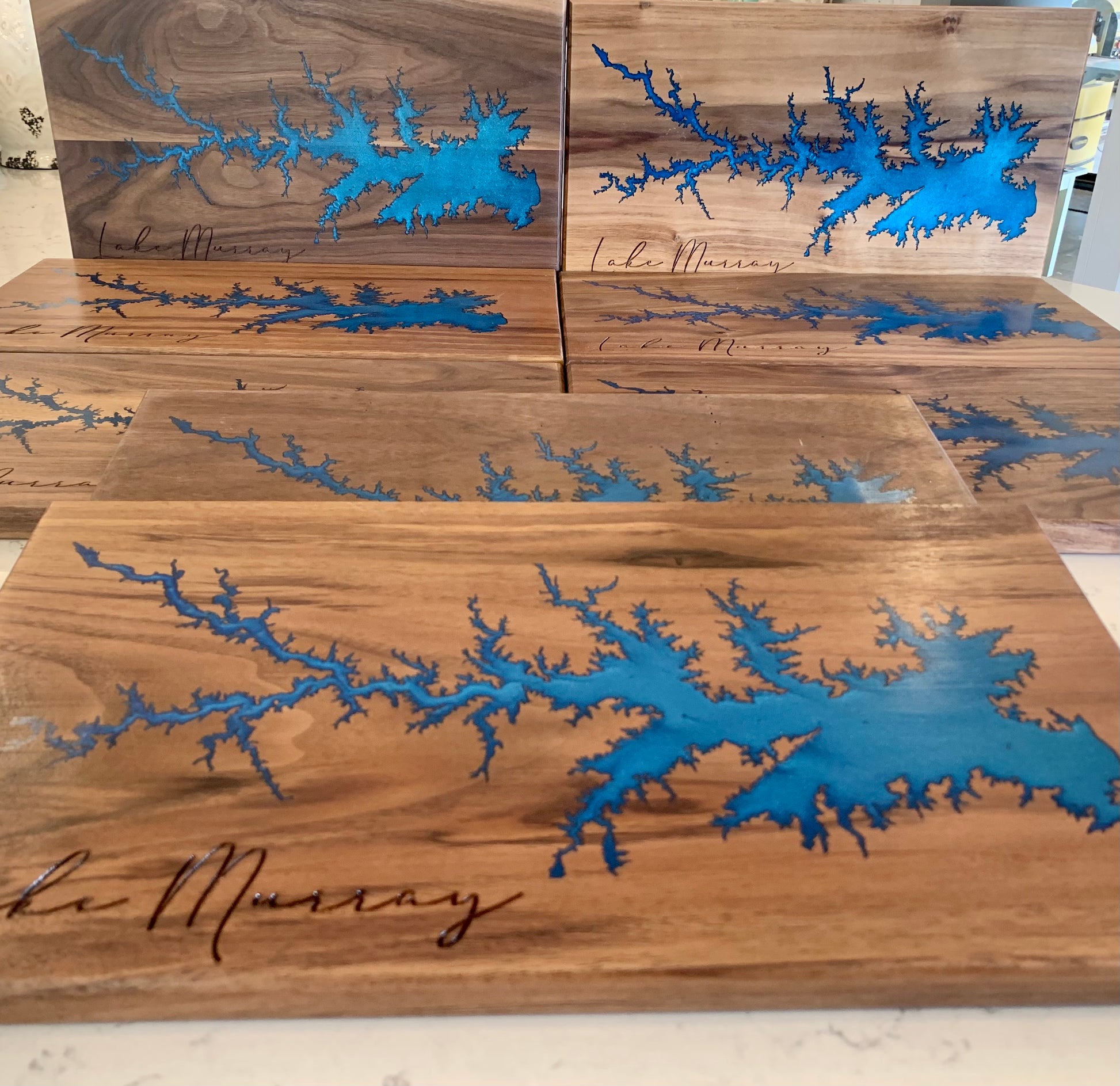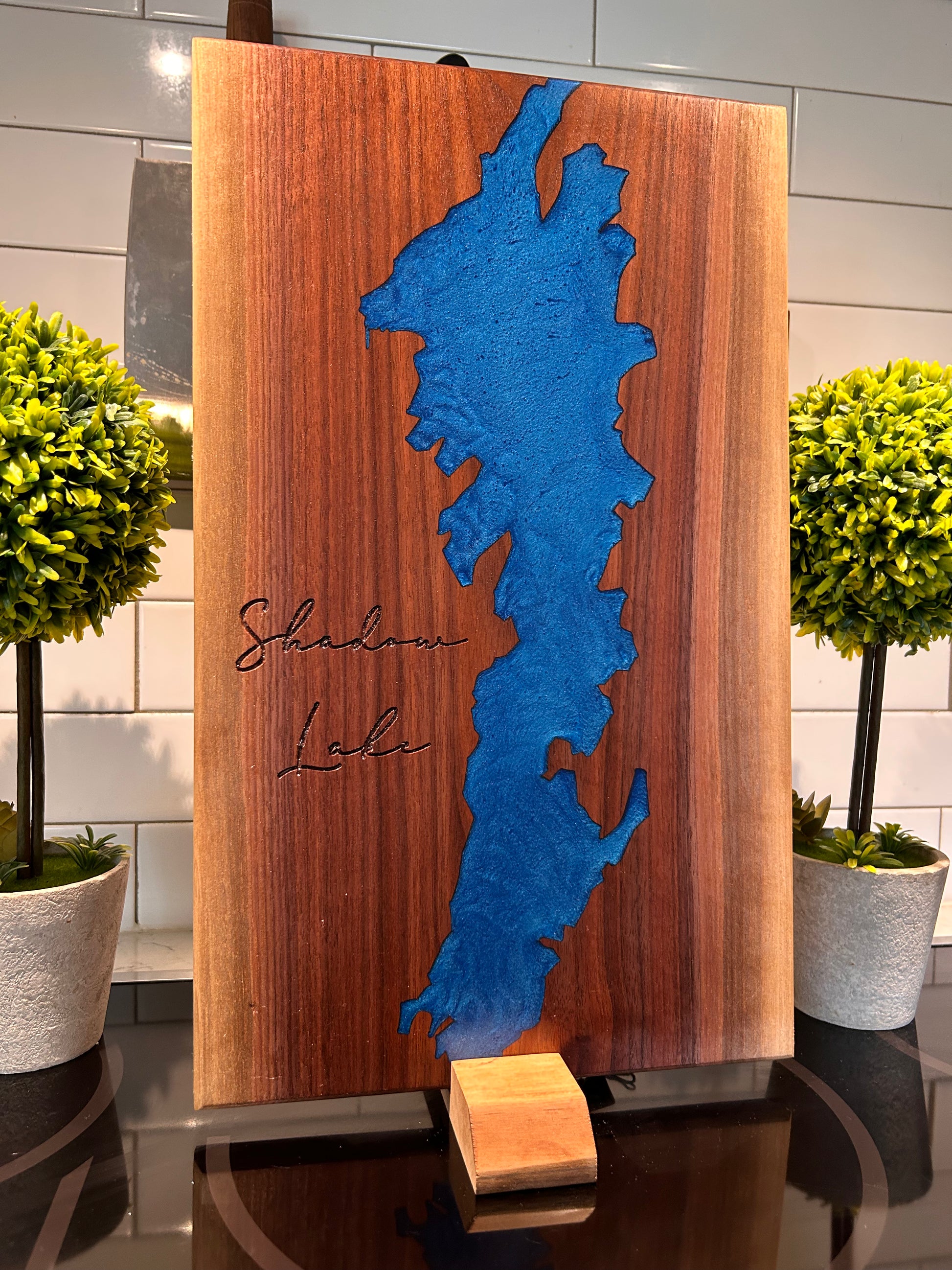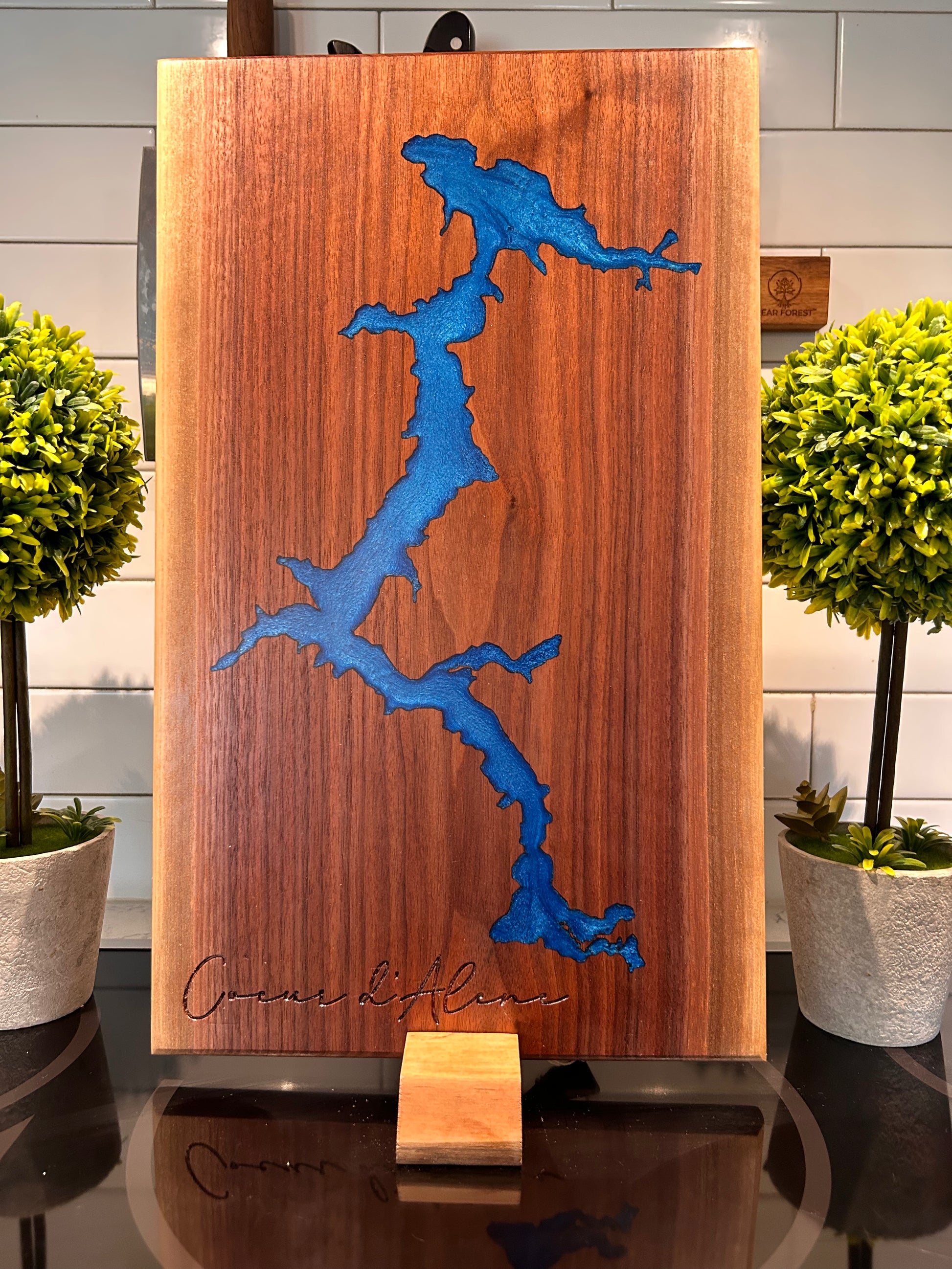 Handcrafted from Black Walnut wood. The lake is filled with blue epoxy and sealed with food-grade oil giving you many options for use in your daily lives!