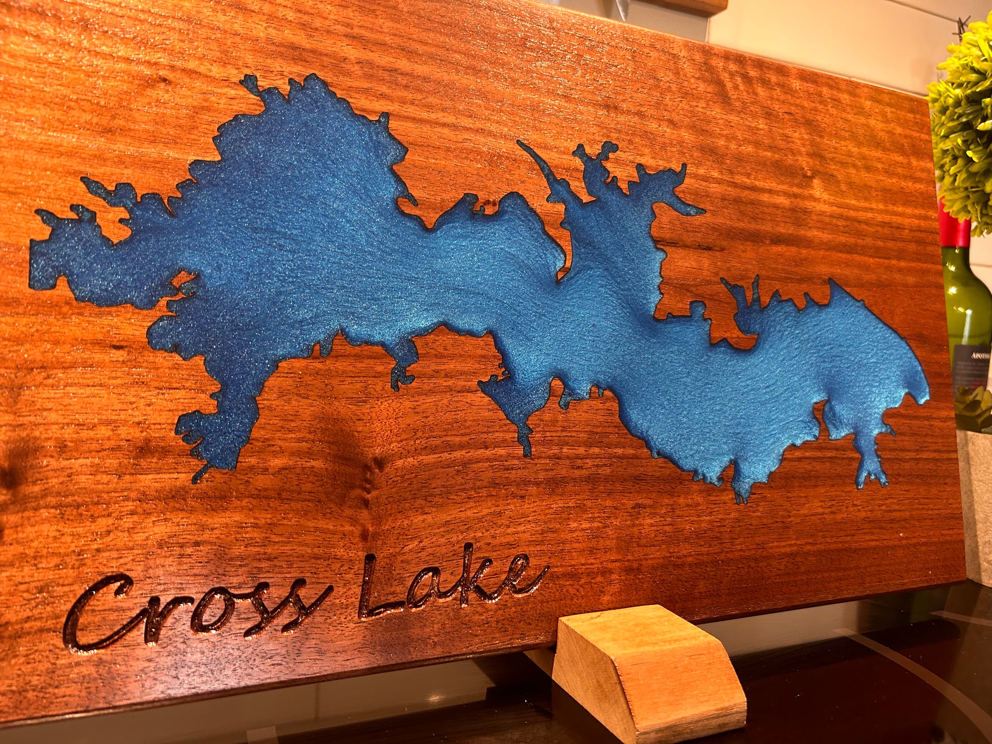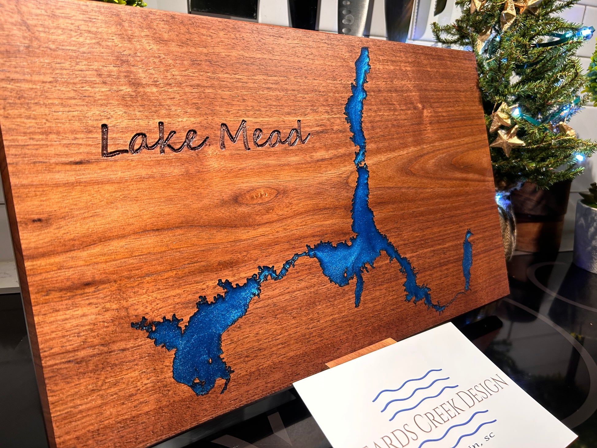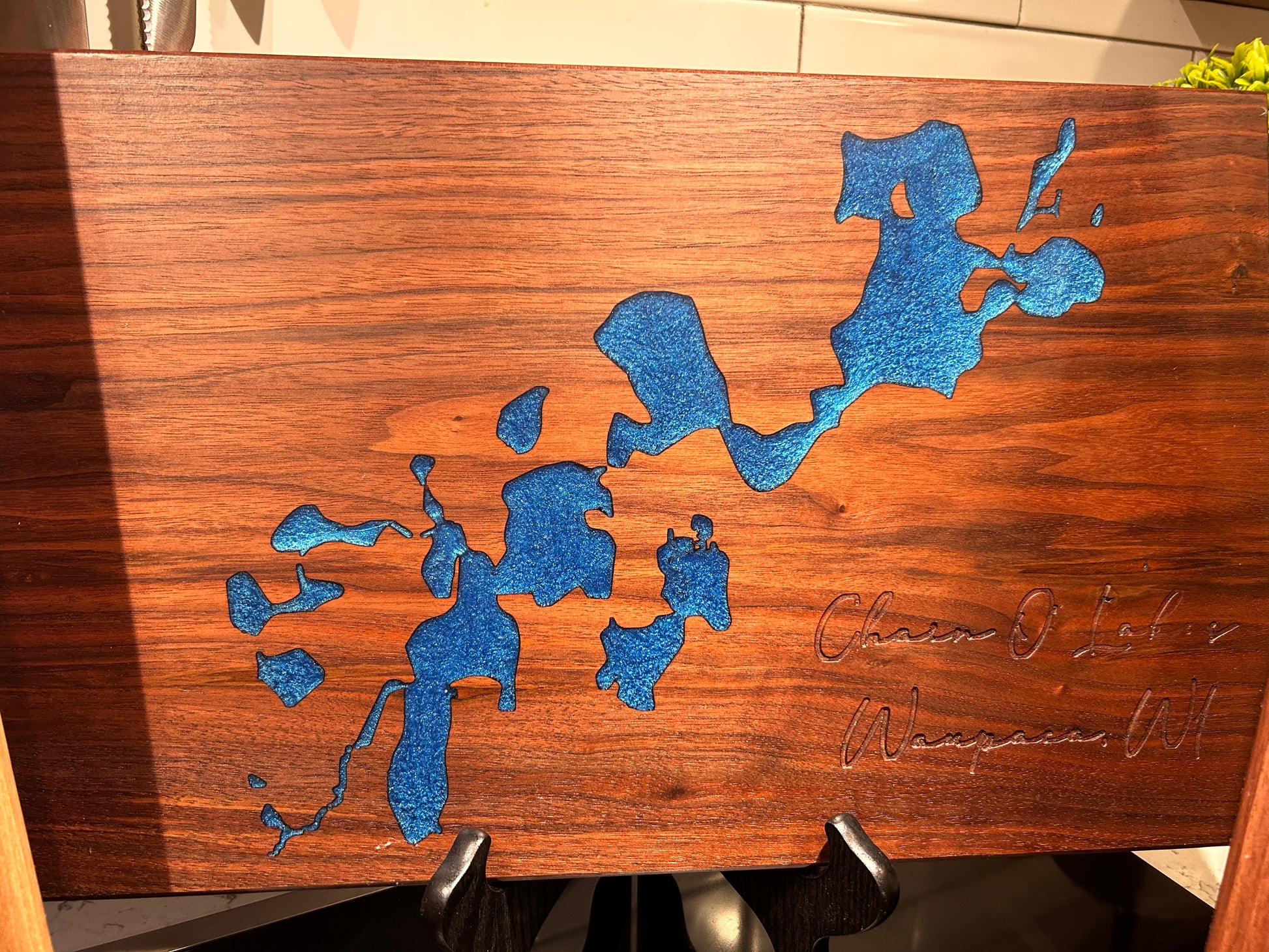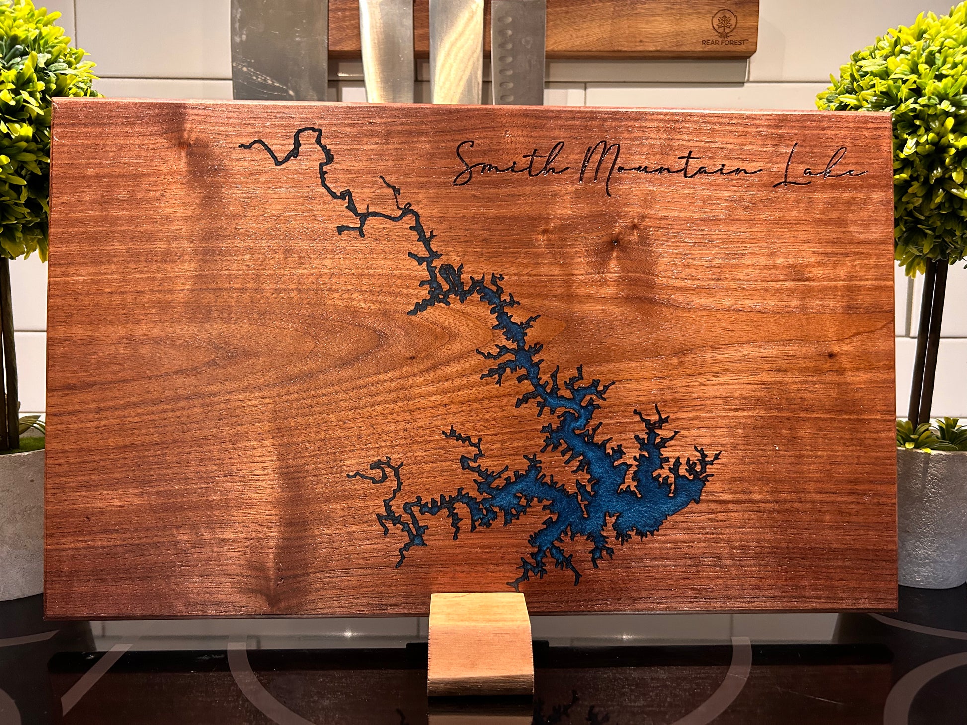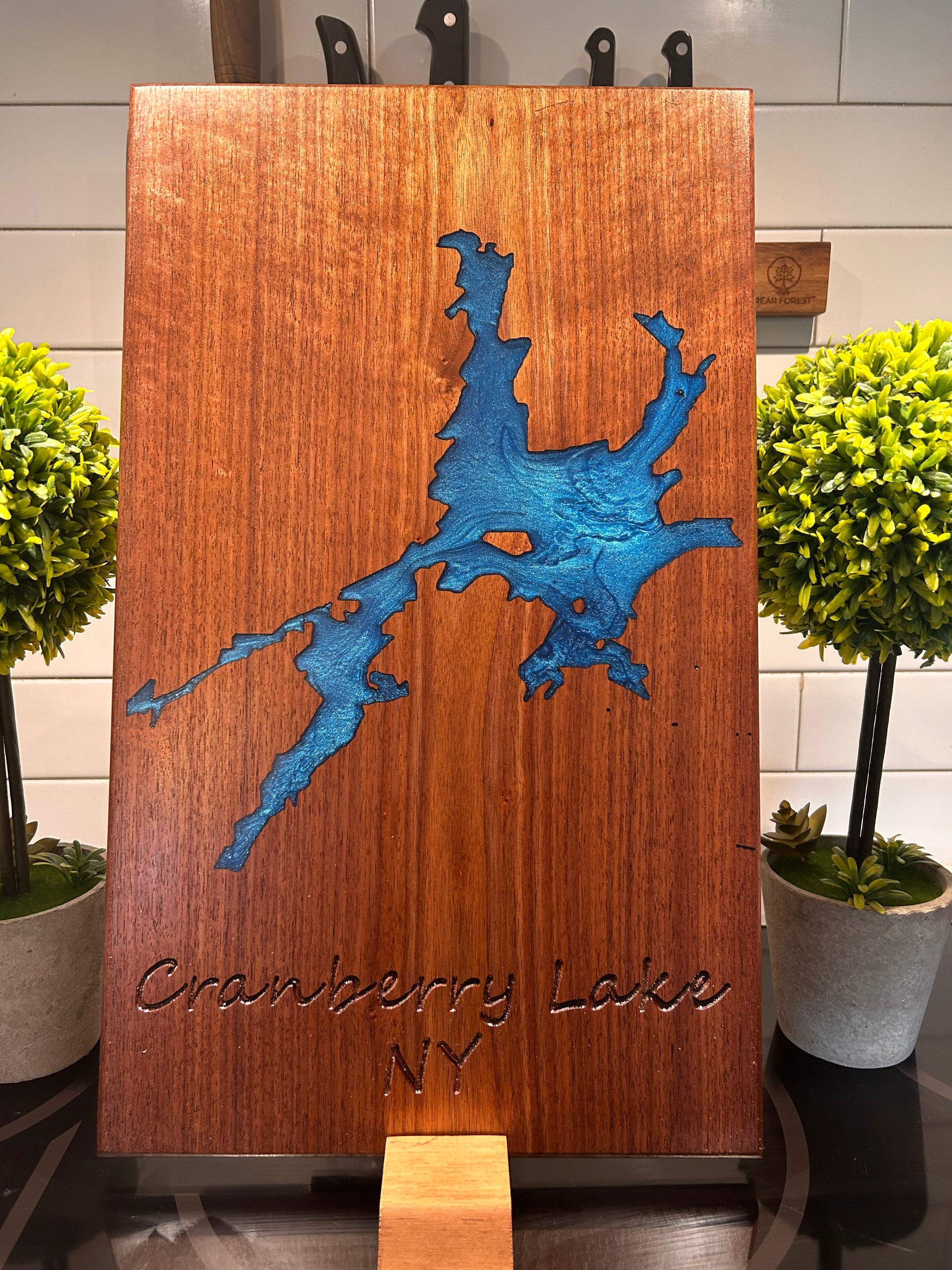 Handcrafted from Black Walnut wood. The lake is filled with blue epoxy and sealed with food-grade oil giving you many options for use in your daily lives!