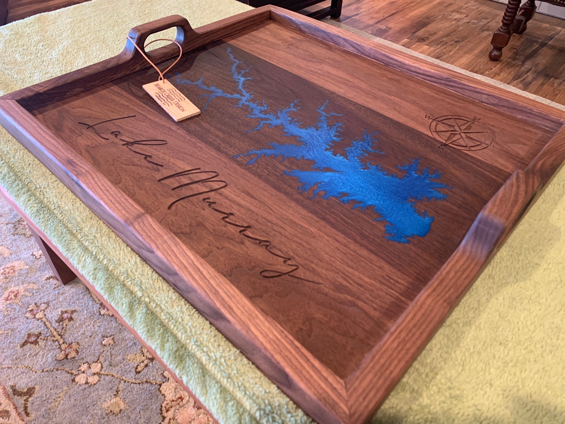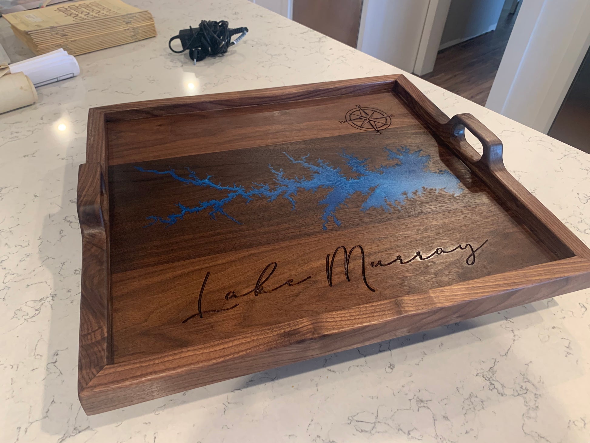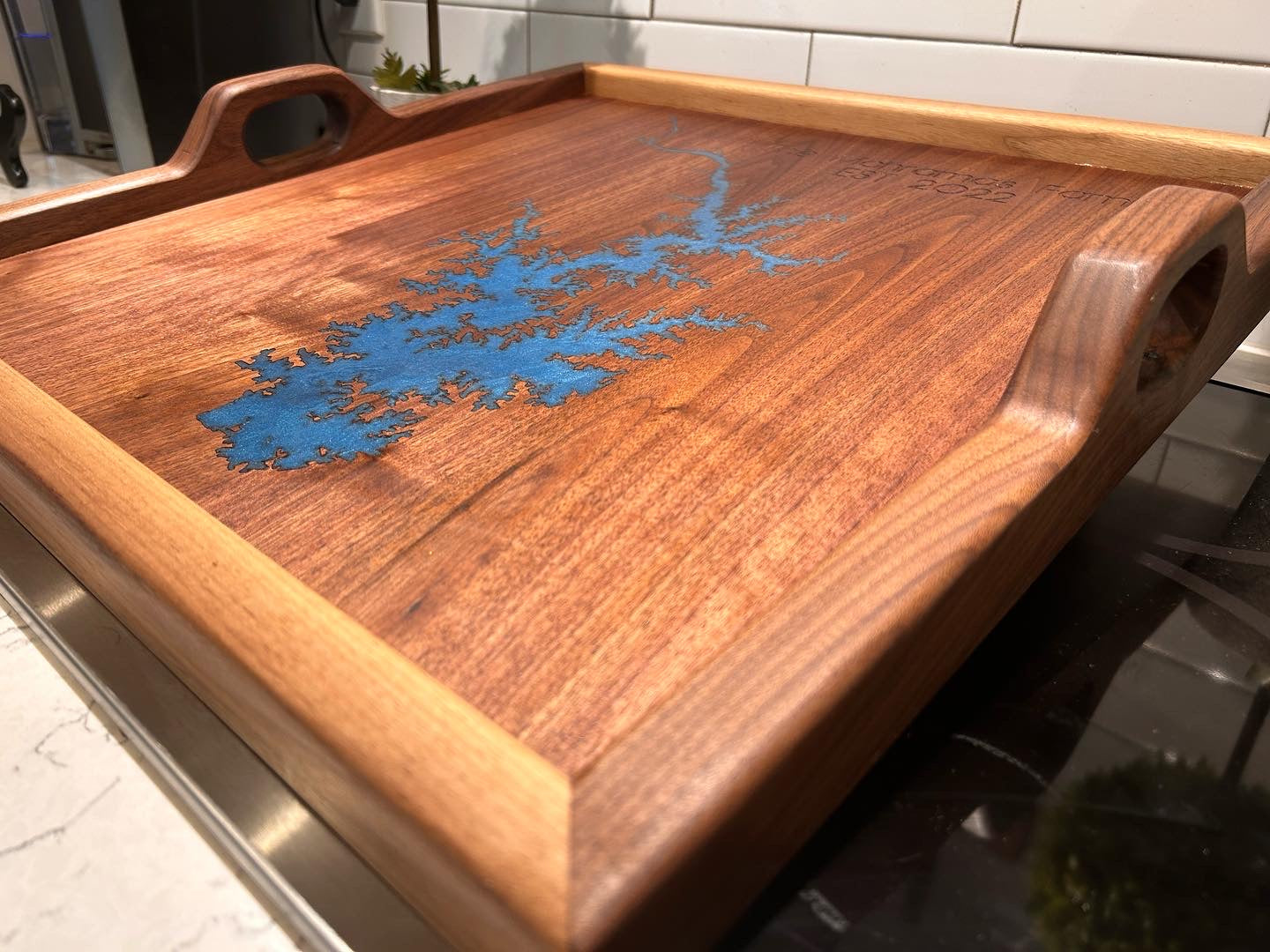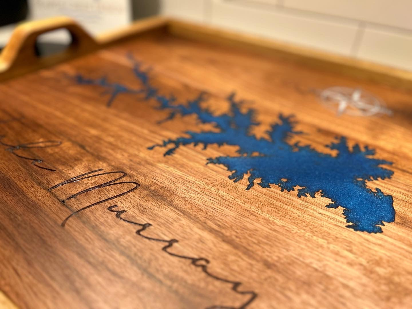 Made from solid 3/4” wood, Your Lake engraved and epoxy filled, sanded smooth and oiled for longevity, here is the perfect tray for all things kitchen, living room, den, serving, charcuterie and more!