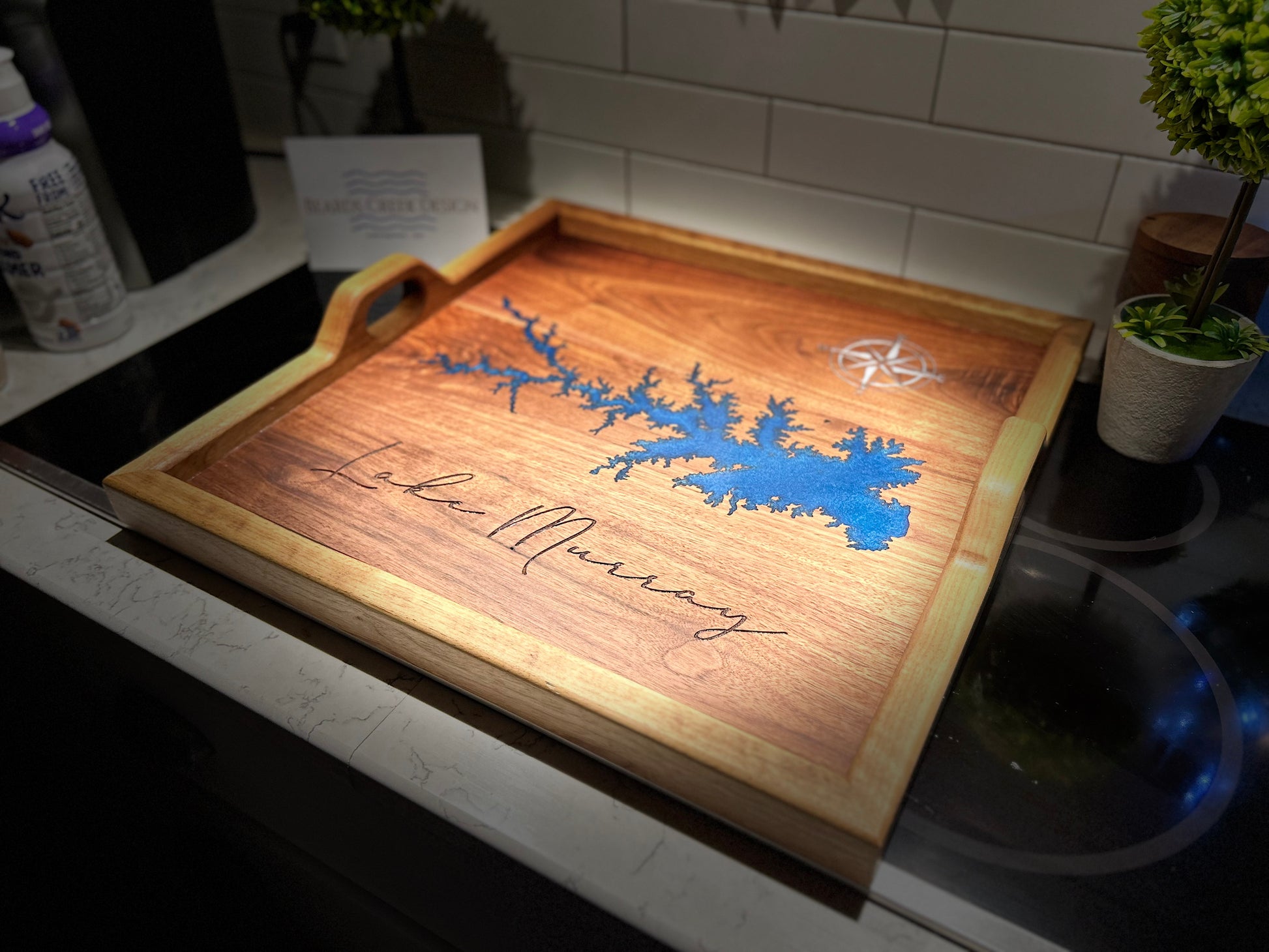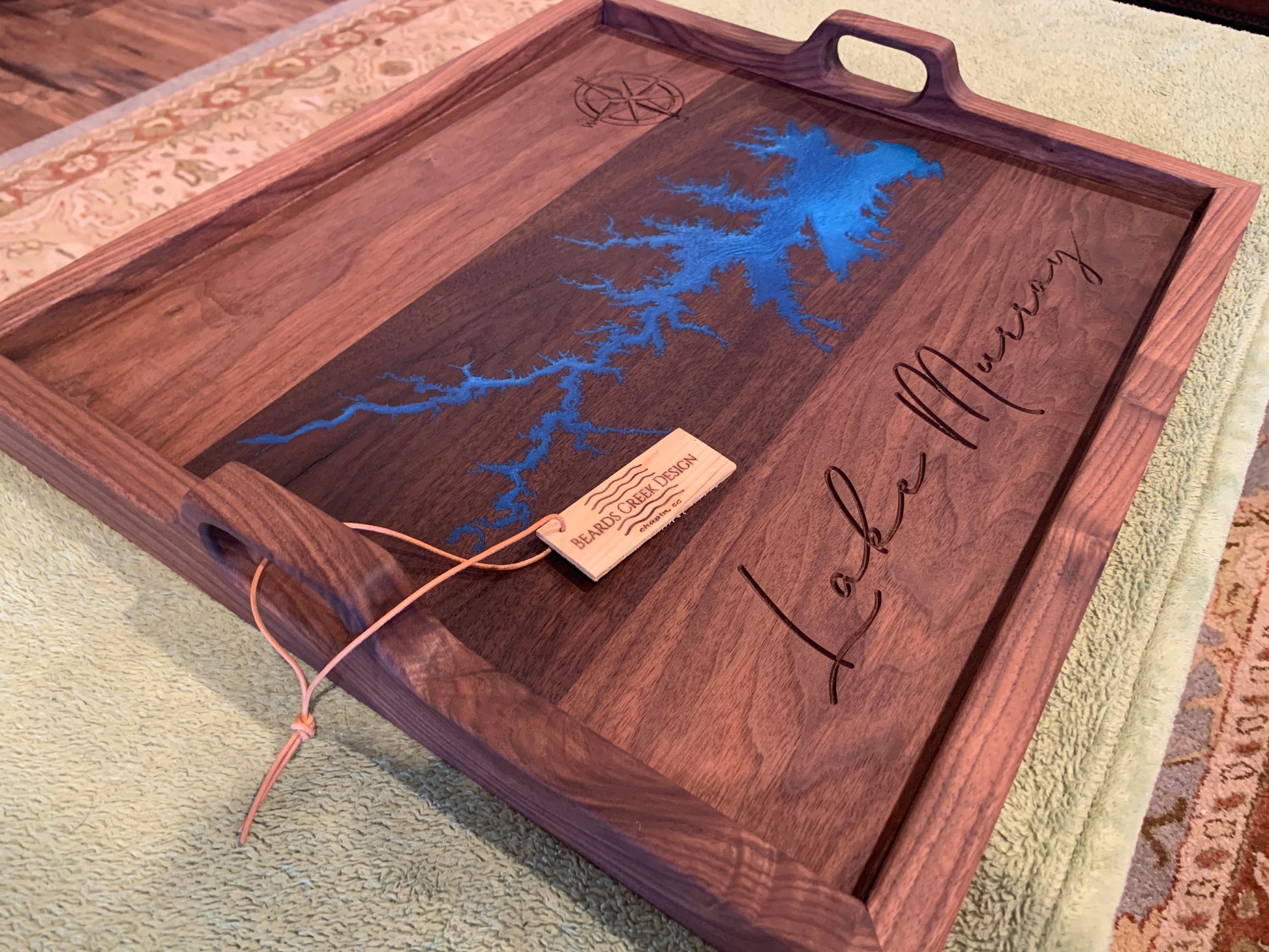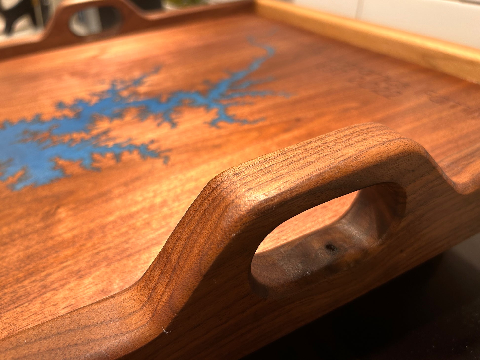 Made from solid 3/4” wood, Your Lake engraved and epoxy filled, sanded smooth and oiled for longevity, here is the perfect tray for all things kitchen, living room, den, serving, charcuterie and more!