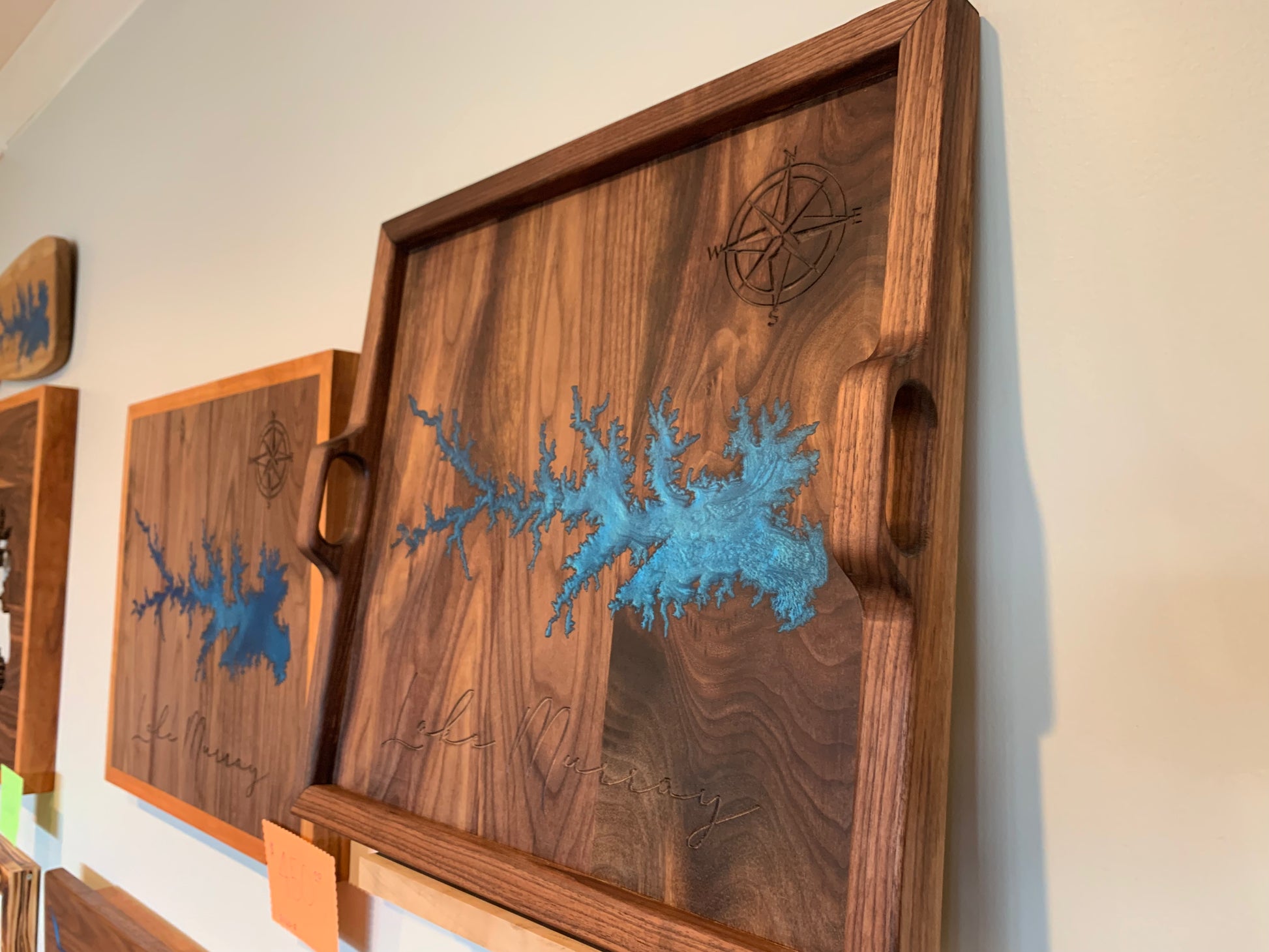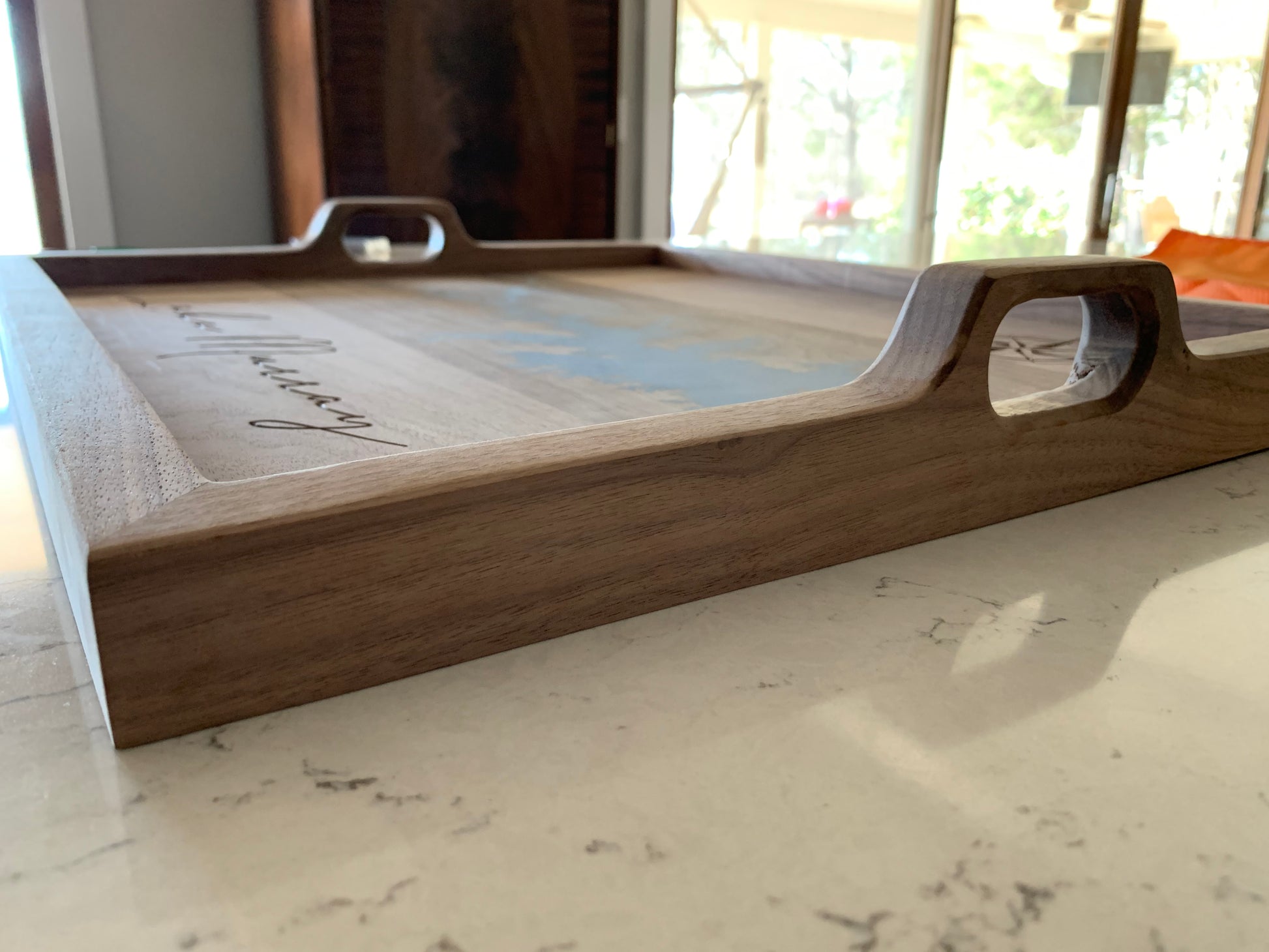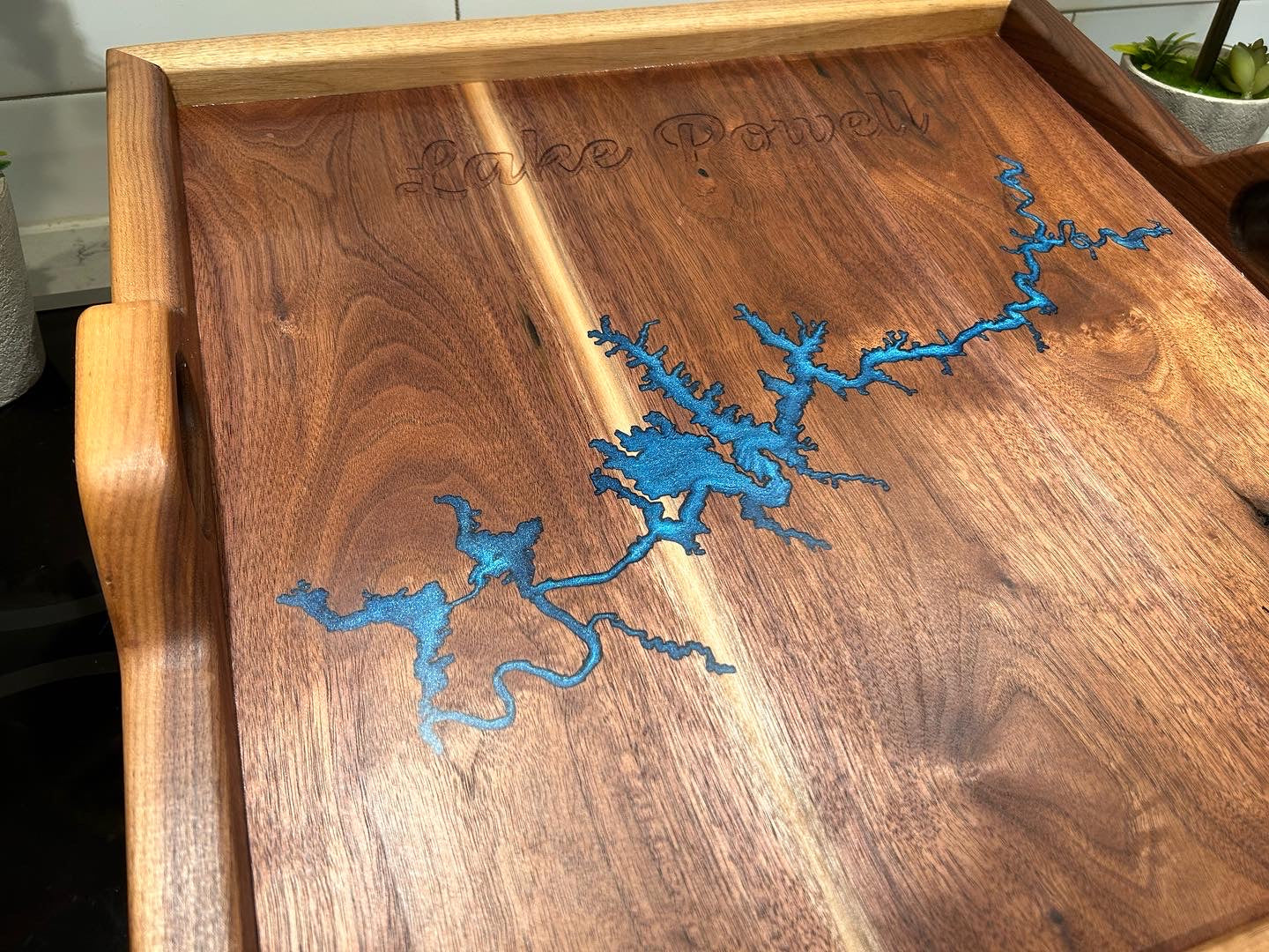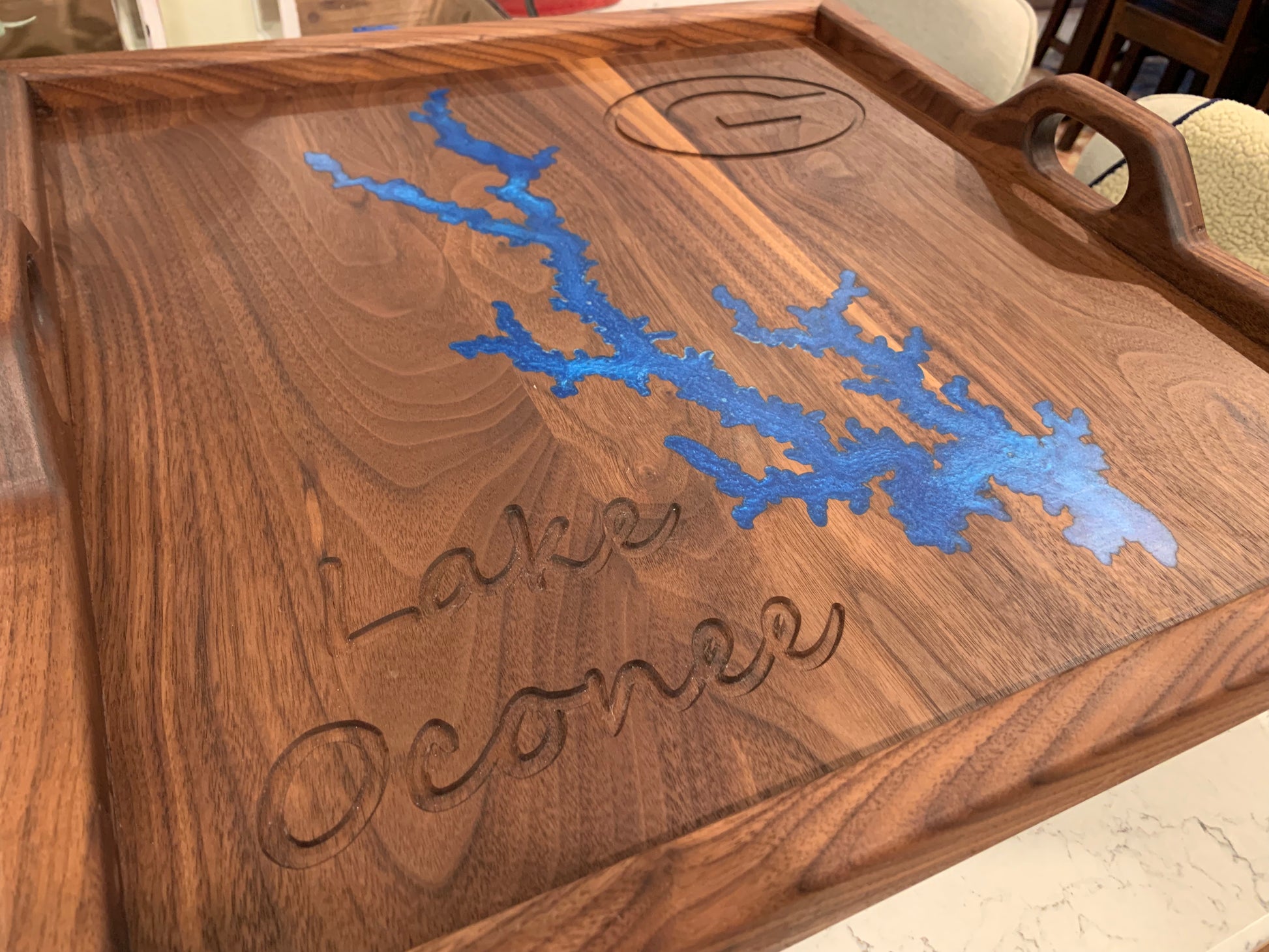 Made from solid 3/4” wood, Your Lake engraved and epoxy filled, sanded smooth and oiled for longevity, here is the perfect tray for all things kitchen, living room, den, serving, charcuterie and more!